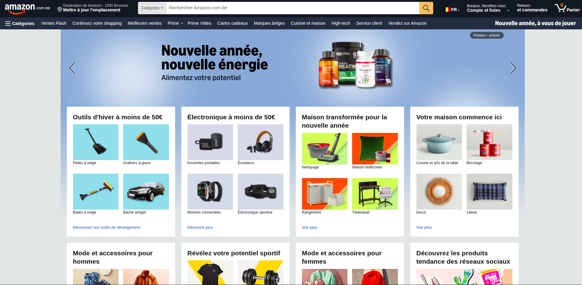 Exemple : Amazon affiche des produits populaires, des promotions et une barre de recherche en haut de page pour une navigation rapide.